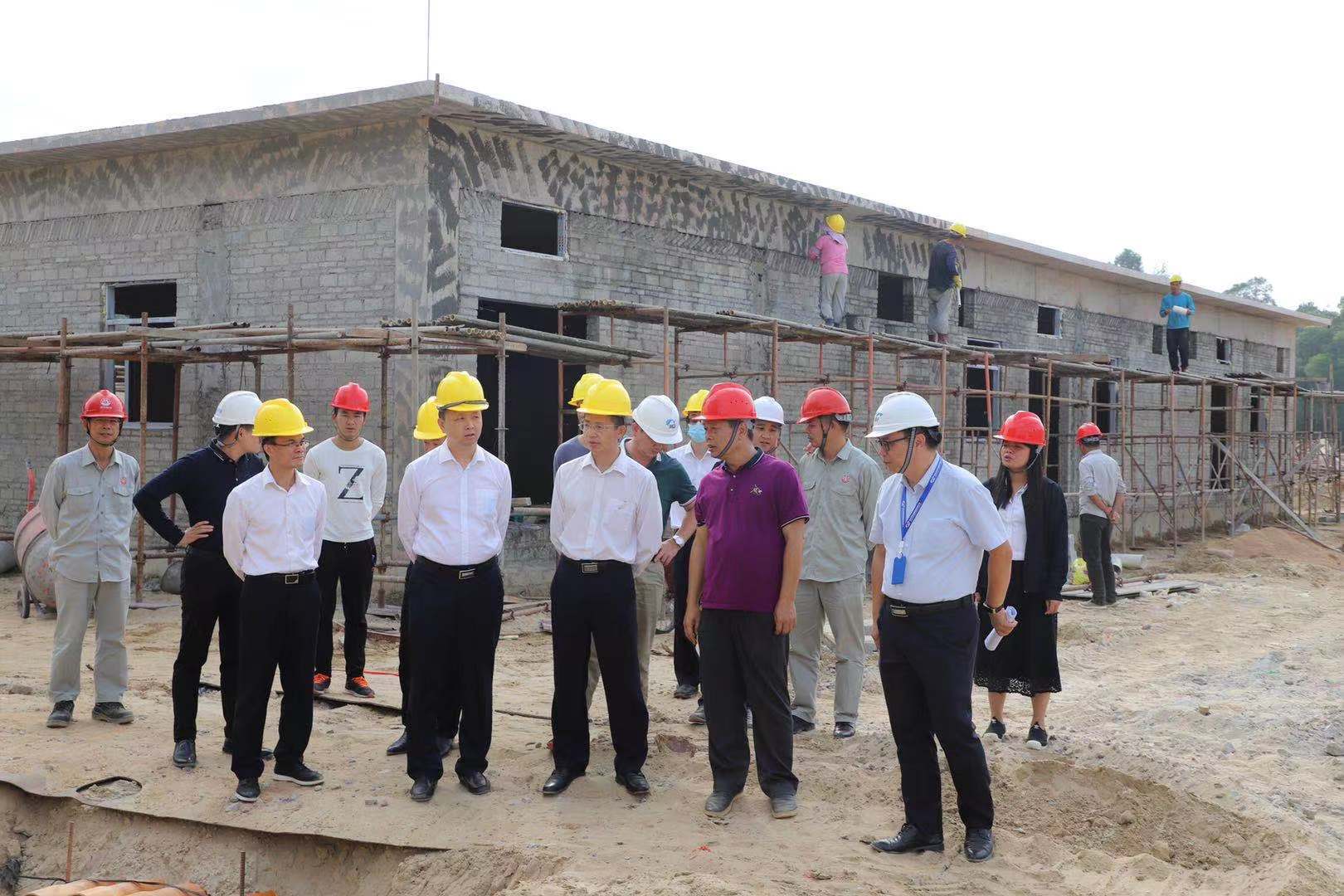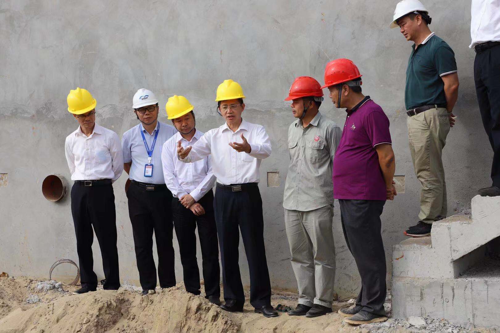 吳世文一行深入博賀水質凈化廠項目施工現場進行察看,現場聽取了施工單位、監理單位有關廠區土地平整、設備進場安裝時間、排污系統管道埋設進度等項目工程進展、建筑工地施工安全措施落實情況匯報,詳細了解施工過程中存在的問題以及加快推進工程進度的舉措,并就項目相關問題進行了探討。