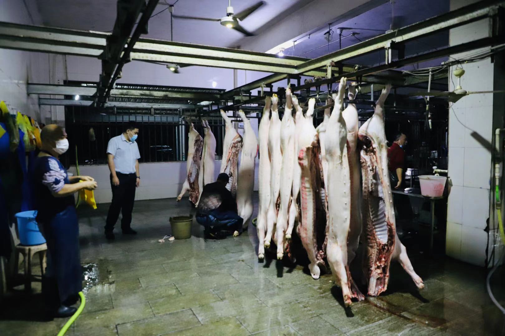 “戴好手套口罩,穿好膠鞋,進場前做好消毒沖水!豬肉分拆處理干凈就趕緊裝車,后面兄弟單位還在排隊,快快快!”凌晨兩點多,茂名濱海發展集團下屬子公司爵山食品公司燈火通明,屠宰工、清洗工數十余人已在緊張有序地開展生豬屠宰一線生產工作。