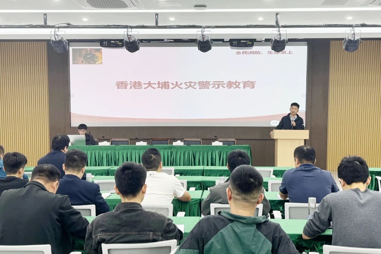 會議中,全體人員集中觀看了香港大埔宏福苑火災事故警示片。隨后,集團安全環保部結合事故案例,深入剖析火災暴露出的安全隱患,并通過專題講解,系統介紹了高層建筑火災特點、預防措施、初期火災撲救方法以及應急疏散逃生自救互救等關鍵知識與實操技能。
