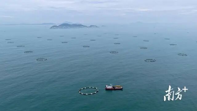 從茂名吉達(dá)港區(qū)東華能源重件碼頭起航,搭乘養(yǎng)殖運(yùn)輸船,約1個小時就能抵達(dá)茂名大竹洲海洋牧場養(yǎng)殖區(qū)。從高空俯瞰,數(shù)十個深水網(wǎng)箱排列在海面,蔚為壯觀。