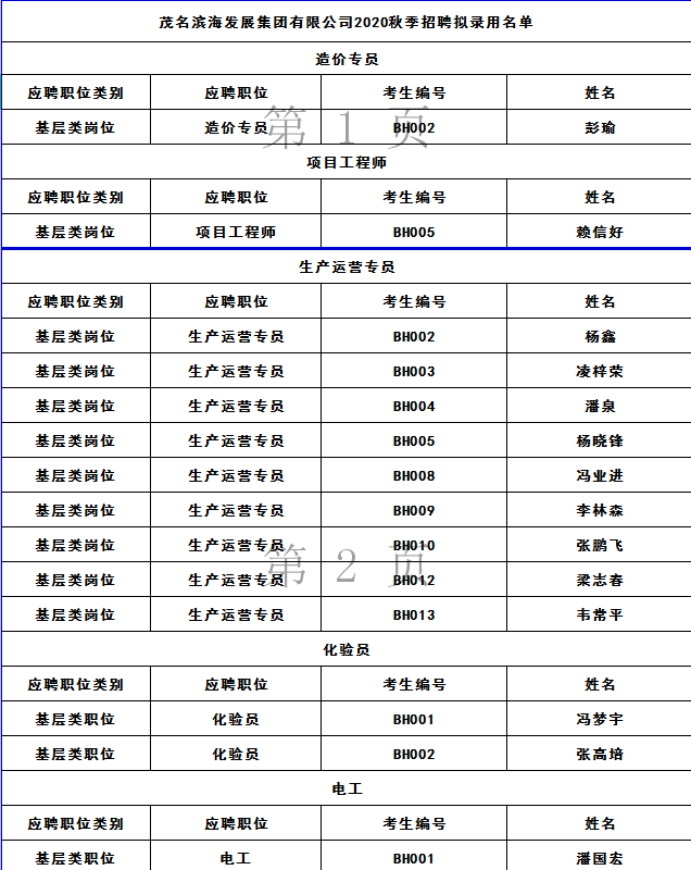 茂名濱海發(fā)展集團有限公司2020年秋季招聘擬錄用名單公示